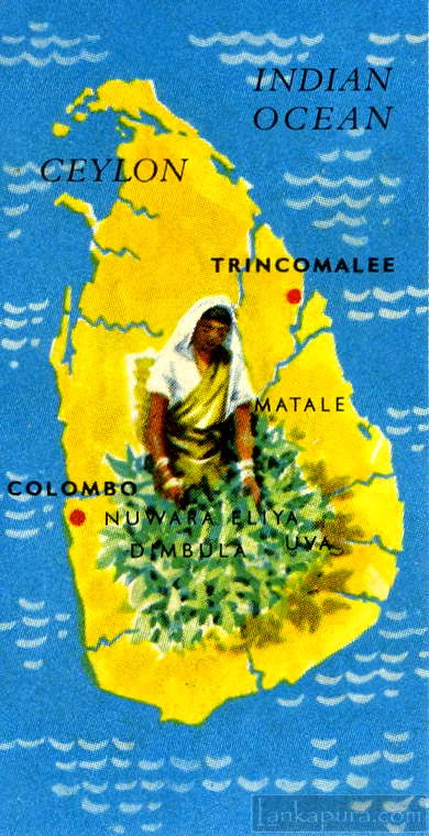 Ceylon lies immediately south of India, separated from it by the narrow Palk Strait. It is shaped like a pear or Pearl-drop and is sometimes referred to as “The Pearl of the East”. Ceylon is 271 miles long and 140 miles broad-about half the size of England. Its ancient name was Lanka, when it was ruled by Sinhalese kings. Today (1955) ceylon is a member of the British Commonwealth. The population of 9 million comprises a diversity of races, with the Sinhalese as the major community, but all people who come from Ceylon are known as Ceylonese. The chief products are tea, rubber, coconuts and rice. On this map the main tea regions are shown. Text on Back of the card